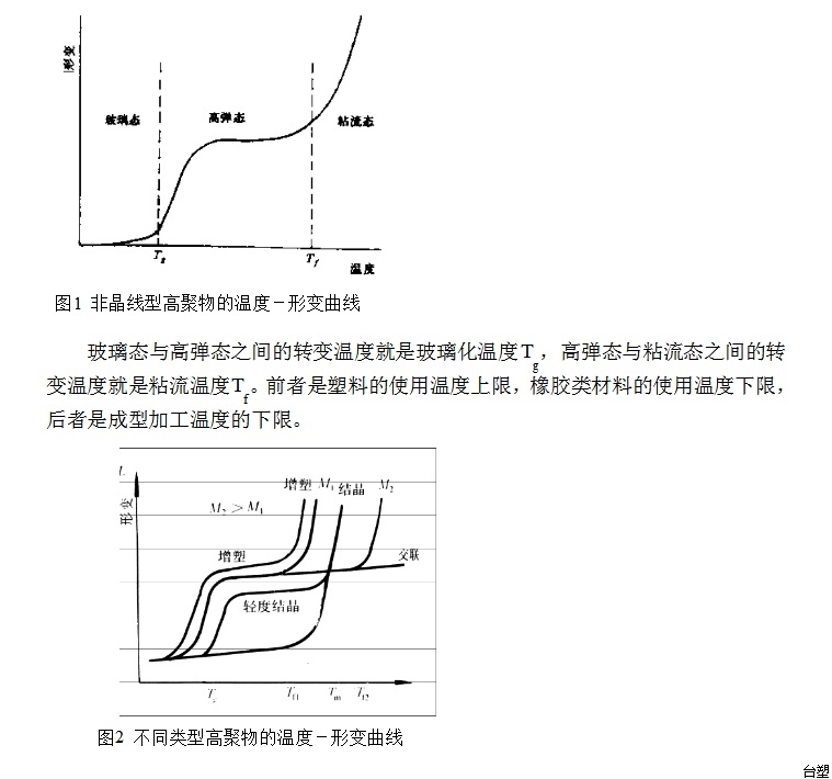 對(duì)于線型非晶聚合物有三種不同的力學(xué)狀態(tài):玻璃態(tài),高彈態(tài),粘流態(tài)。溫度足夠低時(shí),高分子鏈和鏈段的運(yùn)動(dòng)被“凍結(jié)”,外力的作用只能引起高分子鍵長(zhǎng)和鍵角的變化,因此,聚合物的彈性模量大,形變-應(yīng)力關(guān)系服從虎克定律,其機(jī)械性能與玻璃相似,表現(xiàn)出硬而脆的物理機(jī)械性質(zhì),這時(shí)聚合物處于玻璃態(tài),在玻璃態(tài)溫度區(qū)間內(nèi),聚合物的這種力學(xué)性質(zhì)變化不大,因而在溫度—形變曲線上玻璃區(qū)是接近橫坐標(biāo)的斜率很小的一段直線(見圖1);隨著溫度的上升,分子熱運(yùn)動(dòng)能量逐漸增加,到達(dá)玻璃化轉(zhuǎn)變溫度Tg后,分子運(yùn)動(dòng)能量已經(jīng)能夠克服鏈段運(yùn)動(dòng)所需克服的位壘,鏈段首先開始運(yùn)動(dòng),這時(shí)聚合物的彈性模量驟降,形變量大增,表現(xiàn)為柔軟而富于彈性的高彈體,聚合物進(jìn)入高彈態(tài),溫度-形變曲線急劇向上彎曲,隨后基本維持在一“平臺(tái)”上。溫度進(jìn)一步升高至粘流溫度Tf,整個(gè)高分子鏈能夠在外力作用下發(fā)生滑移,聚合物進(jìn)入粘流態(tài),成為可以流動(dòng)的粘液,產(chǎn)生不可逆的永久形變,在溫度-形變曲線上表現(xiàn)為形變急劇增加,曲線向上彎曲。